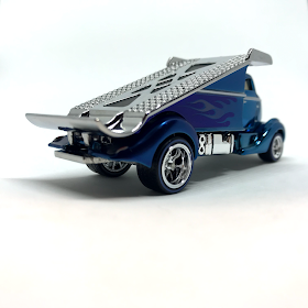 Talk about an awesome piece to add to any diecast collection! I'd say the photos speak for themselves, but I'll add some filler up here. Let's see, it's all metal, rubber wheels, blue mirrorized Spectraflame paint, and superb details. And yup, the ramp tilts. It even stays tilted up if that's ever needed, say for this photo shoot in example. But yeah, I'm impressed for sure. And as it says on the ramp, it's a ramp truck thing... very sweet!